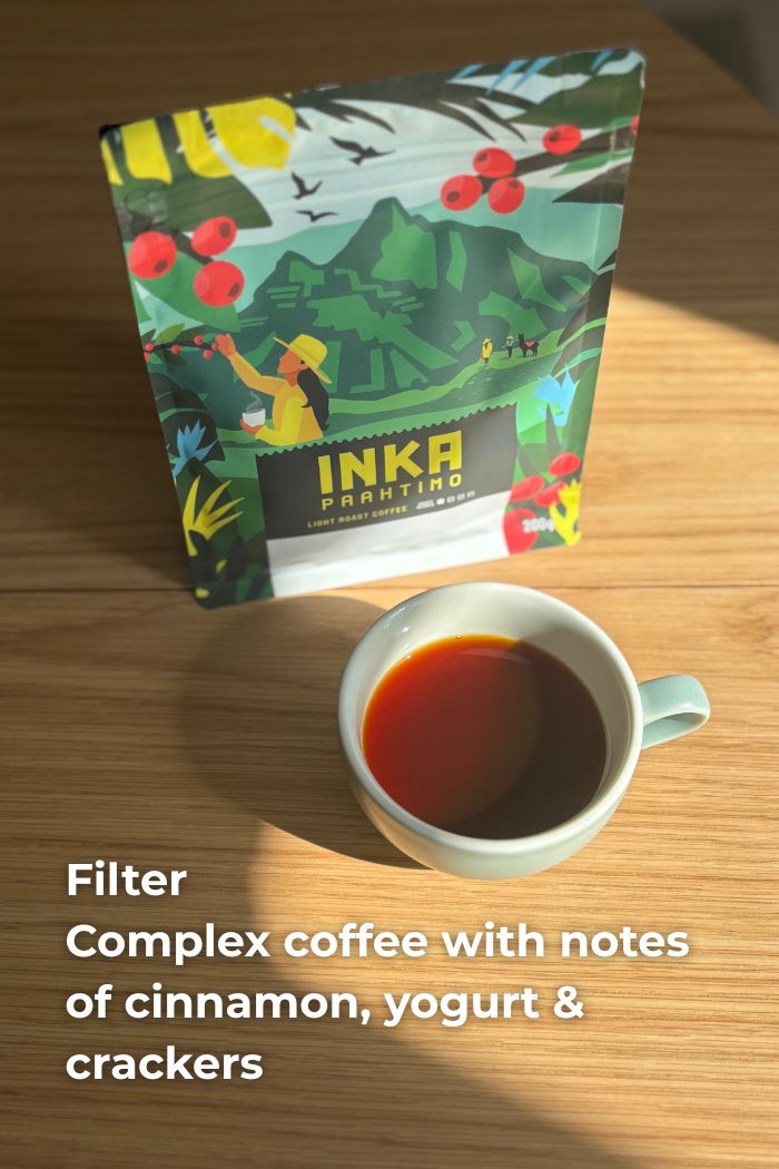 Kompleksinen kahvi, jossa on kanelin, jugurtin ja keksin vivahteita.