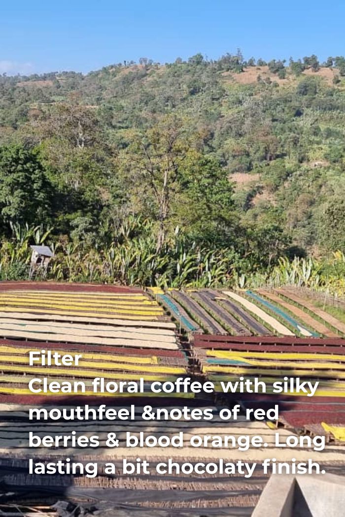 Tämä kahvi on luonnollisesti prosessoitu (Natural), mikä on menetelmä, joka tuo esiin hedelmän ja ympäristön täyden luonteen kupissa. Huolellisen käsinpoiminnan jälkeen kypsät kirsikat lajitellaan ja kuivataan korotetuilla sängyillä auringon alla.